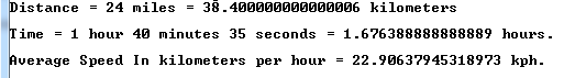 /**<br /> *<br /> * @Author: Aghatise Osazuwa<br /> * Website: www.cscprogrammingtutorials.com<br /> *<br /> * Exercise 1.12 - Average Speed In Kilometers<br /> *<br /> */ <br /><br />public class Ex1_12 {<br /> public static void main(String[] args) {<br /> System.out.println("Distance = 24 miles =" + (24.0 * 1.6) + " kilometersn");<br /> System.out.println("Time = 1 hour 40 minutes 35 seconds" + " = "<br /> + (1 + (((40.0 * 60.0) + 35.0) / 3600)) + " hours.n");<br /> System.out.print("Average Speed In kilometers per hour = ");<br /> System.out.println(((24.0 * 1.6) / (1 + (((40.0 * 60.0) + 35.0) / 3600)))<br /> + " kph.");<br /> }<br />} |
